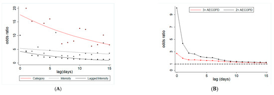 All three measures of daily lagged dust exposure were associated with both 2+ AECOPD and 3+ AECOPD for up to 15 days (Figure 6). For example, odds of 2+ AECOPD and 3+ AECOPD were 28% and 20% higher (even for the 15th day distributed lagged dust exposure), respectively (for 2+ AECOPD: odds ratio = 1.28; 95% CI = 1.09–1.51; p < 0.001; for 3+ AECOPD: odds ratio = 1.21; 95% CI = 1.07–1.36; p < 0.001; Table 8). For two other dust exposures, the odds of AECOPD varied with the increase in time lag. For example, 2+ AECOPD were 10× more likely to occur with a unit increase in dust intensity on the same day of the event, which gradually declined up to five days, and became 11× by six-day lag (Figure 6). A similar pattern was observed for 3+ AECOPD. A dust exposure that occurred 15 days before the AECOPD event was associated with 5.5× higher odds of 3+ AECOPD (odds ratio ~5.5; 95% CI = 1.57–19.3; p < 0.001).