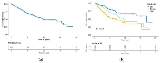 Kaplan–Meier curves for disease specific survival: (a) Disease specific survival curve of the institutional cohort; (b) Disease specific survival curves for low-, medium- and high-risk strata. Logrank test was performed for comparisons between survival.