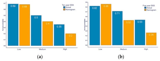 Actual disease specific survival vs. nomogram disease specific survival: (a) Five-year DSS categorised in low-, medium- and high-risk group, scenario 1; (b) Ten-year DSS categorised in low-, medium- and high-risk group, scenario 1.