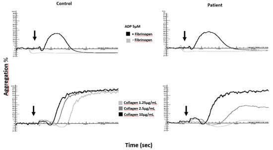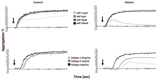 Aggregation curves in citrated platelet-rich plasma (cPRP) of a δ-SPD patient and a healthy control (Control) in response to ADP (2.5, 5, 20, and 100 µM) and collagen (1.25, 2.5, and 10 µg/mL); arrows denote the times of addition of the agonists to cPRP.