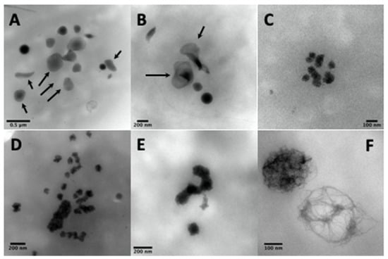 The electron-dense elements not counted as dense-granules are calcium- and phosphorus-poor veils [] (A,B, arrows), clusters of spongy elements (C), also present in the form of chains or larger grains (D,E), which are found in abundance and bigger in STIM1–York–Stormorken pathologies and are rich in calcium and phosphorus [], while others are poorer in calcium (F), which could represent immature dense-granules (possibly polyphosphate filaments without calcium accumulation, found in non-identified cases of delta deficiency, but not in Hermansky–Pudlak syndrome).