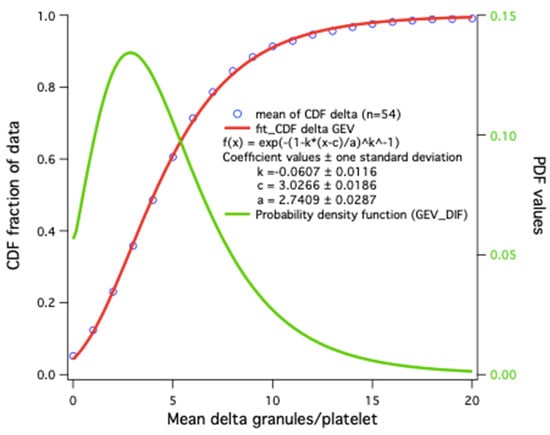 Distribution model of the number of dense-granules/platelet: cumulative distribution frequency (CDF) averages in 54 controls (blue circles). The simplest fit is a generalized extreme value (GEV) distribution function (red); the corresponding probability density obtained by CDF derivative (Igor Wavemetrics) is shown in green.