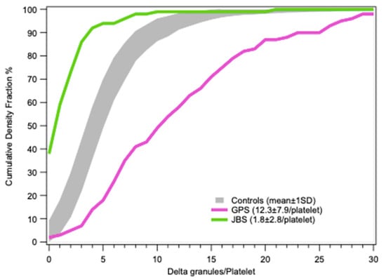 Cumulative frequencies of dense-granule distributions in platelets (mean ± 1SD) in controls (gray, n = 54) and two cases of macrothombocytopenia with similar platelet size distributions, a patient with GPS whose platelet dense granule content may be considered to be normal and a patient with Jacobsen syndrome (JBS) having a severe deficit.