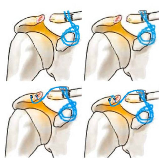 - Shin, S.-J.; Kim, N.-K. Complications After Arthroscopic Coracoclavicular Reconstruction Using a Single Adjustable–Loop-Length Suspensory Fixation Device in Acute Acromioclavicular Joint Dislocation. Arthrosc. J. Arthrosc. Relat. Surg. 2015, 31, 816–824. [Google Scholar] [CrossRef]