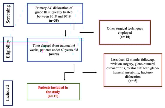 - Fraschini, G.; Ciampi, P.; Scotti, C.; Ballis, R.; Peretti, G.M. Surgical treatment of chronic acromioclavicular dislocation: Comparison between two surgical procedures for anatomic reconstruction. Injury 2010, 41, 1103–1106. [Google Scholar] [CrossRef]