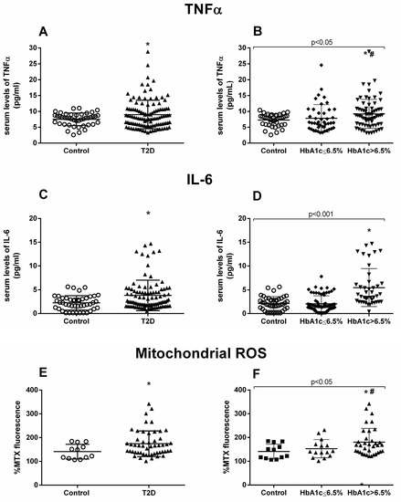 TNFα, IL-6, and mtROS measurements. Serum levels of proinflammatory cytokines TNFα (A,B) and IL-6 (C,D), and fluorescence levels of mtROS (E,F). Differences between control and T2D groups (A,C,E) or between control, well-controlled (HbA1c ≤ 6.5%) and poorly controlled diabetic groups (HbA1c > 6.5%) (B,D,F) are shown. Statistical analysis was performed using a t-test to compare two groups, and using ANOVA with Bonferroni post-test for three groups. *p < 0.05 vs. control; # p < 0.05 vs. T2D HbA1c < 6.5%.