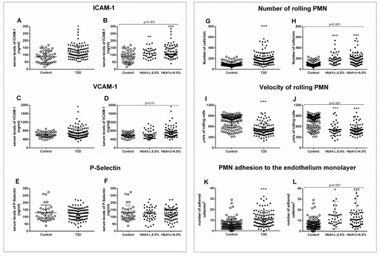 Serum levels of soluble adhesion molecules and measurement of PMN–endothelium interactions. Differences in adhesion molecules between control and T2D groups (A,C,E) or between control, well-controlled diabetics (HbA1c ≤ 6.5%), and poorly controlled diabetics (HbA1c > 6.5%) (B,D,F) are shown. The number of rolling cells (G,H), their velocity (I,J), and the adhesion of these cells to the endothelial monolayer (K,L) were analyzed. Differences between control and T2D groups (G,I,K) or between control, well-controlled diabetics (HbA1c ≤ 6.5%), and poorly controlled diabetic groups (HbA1c > 6.5%) (H,J,L) are shown. Statistical analysis was performed by means of a t-test to compare two groups, and using ANOVA with Bonferroni post-test for three groups. * p < 0.05; ** p < 0.01; *** p < 0.001 vs. control.