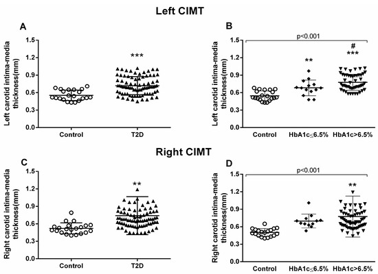Measurement of carotid intima–media thickness (CIMT). Left carotid (A,B) and right carotid (C,D) were analyzed. Differences between control and T2D groups (A,C) or between control, well-controlled (HbA1c ≤ 6.5%), and poorly controlled diabetic groups (HbA1c > 6.5%) (B,D) are shown in the graphs. Statistical analysis was performed by means of a t-test to compare two groups, and using ANOVA with a Bonferroni post-test for three groups. ** p < 0.01; *** p < 0.001 vs. control group; # p < 0.05 vs HbA1c ≤ 6.5% group.