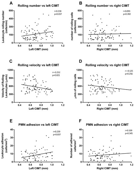 Correlation graphs of adhesion assay vs. CIMT measures. Graphs show correlations between number of rolling PMN and left (A) and right CIMT (B); rolling velocity and left (C) and right CIMT (D); and cell adhesion and left (E) and right CIMT (F). Spearman correlation analysis was performed.