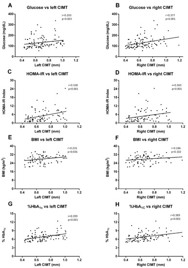 Regarding biochemical parameters, we saw that left CIMT measures correlated significantly with glucose (p = 0.003, r = 0.203) (Figure 5A), HOMA-IR (p < 0.001, r = 0.338) (Figure 5C), BMI (p = 0.036, r = 0.235) (Figure 5E), and HbA1c (p < 0.001, r = 0.399) (Figure 5G). These correlations were similar for the right CIMT, except for BMI correlation, which was not significant (Figure 5B (Glucose), p < 0.001, r = 0.377; Figure 5D (HOMA-IR), p < 0.001, r = 0.360; Figure 5F (HbA1c), p < 0.001, r = 0.389).