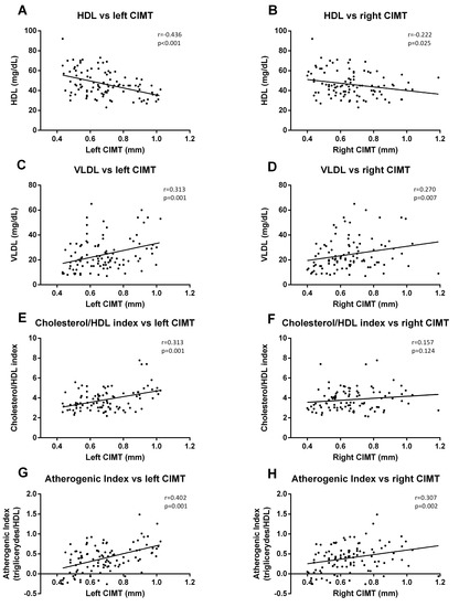 When we analyzed the correlation with lipid parameters, we observed that left CIMT was significantly correlated with HDL-c (p < 0.001, r = −0.436) (Figure 6A), VLDL (p = 0.001. r = 0.313) (Figure 6C), cholesterol/HDL index (p = 0.001, r = 0.313) (Figure 6E), and AIP (p = 0.001, r = 0.402) (Figure 6G). The data for right CIMT revealed similar correlations (Figure 6B (HDL-c), p = 0.025, r = −0.222; Figure 6D (VLDL), p = 0.007, r = 0.270; Figure 6H (AIP), p = 0.002, r = 0.307), with the exception of cholesterol/HDL index correlation.