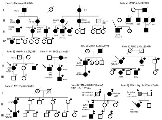 - Hoedemaekers, Y.M.; Caliskan, K.; Michels, M.; Frohn-Mulder, I.; van der Smagt, J.J.; Phefferkorn, J.E.; Wessels, M.W.; ten Cate, F.J.; Sijbrands, E.J.; Dooijes, D.; et al. The importance of genetic counseling, DNA diagnostics, and cardiologic family screening in left ventricular noncompaction cardiomyopathy. Circ. Cardiovasc. Genet. 2010, 3, 232–329. [Google Scholar] [CrossRef]