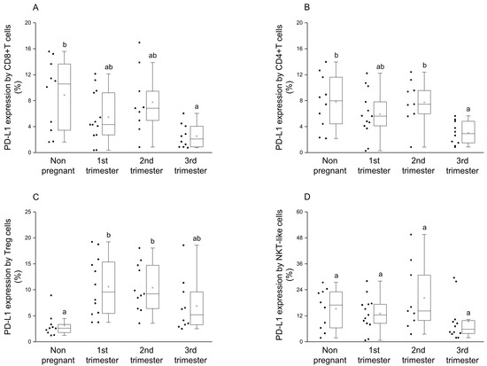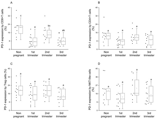 PD-1 receptor expression by different T cell throughout pregnancy and in nonpregnant women. The expression of PD-1 molecule by CD8+T cell (A), CD4+T (B), Regulatory T (Treg) (C) and NKT-like (D) subpopulations. The solid bars represent medians of 10, 13, 10 and 12 samples, the boxes indicate the interquartile ranges and the lines show the most extreme observations. Differences were considered statistically significant for p-values ≤ 0.05. Variables with the same letter indicate no statistically significant difference, while different letters indicate a statistically significant difference.