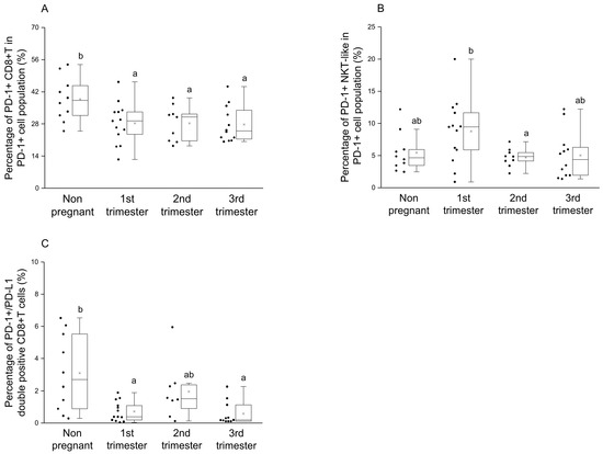 Percentage of PD-1+ immune cell subpopulations in PD-1+ cells and the percentage of PD-1/PD-L1 double-positive CD8+T cells throughout pregnancy and in nonpregnant women. The percentage of the PD-1+ CD8+T cells (A) and PD-1+ NKT-like (B) cells in the PD-1+ cell population (A) and the percentage of PD-1+/PD-L1 double-positive CD8+T cells (C) The solid bars represent medians of 10, 13, 10 and 12 samples, the boxes indicate the interquartile ranges, and the lines show the most extreme observations. Differences were considered statistically significant for p-values ≤ 0.05. Variables with the same letter indicate no statistically significant difference, while different letters indicate a statistically significant difference.