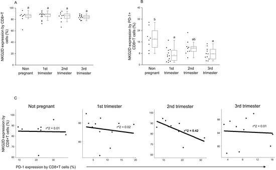 Connection between NKG2D activator receptor and PD-1 inhibitory immune checkpoint receptor expression on CD8+T cells throughout pregnancy and in nonpregnant women. The surface expression of NKG2D receptor by CD8+T cells (A) and PD-1+ CD8+T cells (B). The solid bars represent medians of 10, 13, 10 and 12 samples, the boxes indicate the interquartile ranges and the lines show the most extreme observations. Differences were considered statistically significant for p-values ≤ 0.05, Variables with the same letter indicate no statistically significant difference, while different letters indicate a statistically significant difference. Linear regression analyses between PD-1 and NKG2D surface receptor expressions by CD8+T cells (C) in women during healthy pregnancy and in nonpregnant women. p values and coefficients of determination (R2) were calculated in R.