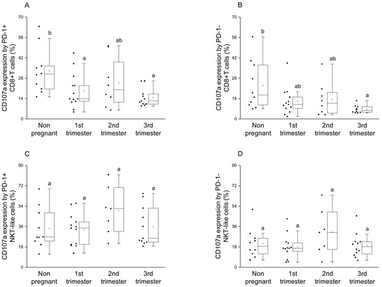 Cytotoxic activity of peripheral PD-1 positive and negative CD8+T cells and NKT-like cells throughout pregnancy and in nonpregnant women. The expression of CD107a molecule by PD-1 positive (A), PD-1 negative (B) CD8+T cells and PD-1 positive (C), PD-1 negative (D) NKT-like cells. The solid bars represent medians of 10, 13, 10 and 12 samples, respectively, the boxes indicate the interquartile ranges and the lines show the most extreme observations. Differences were considered statistically significant for p-values ≤ 0.05. Variables with the same letter indicate no statistically significant difference, while different letters indicate a statistically significant difference.