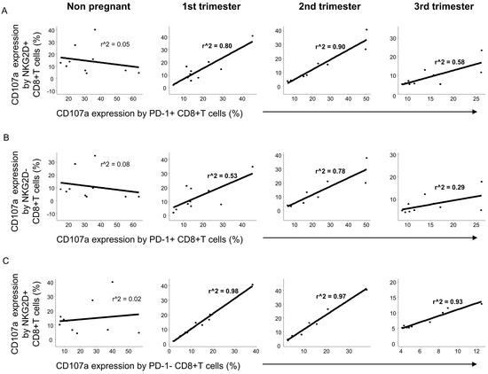 Positive linear regression was observed between the cytotoxic activity of PD-1 positive and NKG2D positive CD8+T cells during the three trimesters of pregnancy but not in nonpregnant conditions (Figure 7A). A weaker relationship was detected in the cytotoxicity of PD-1 positive and NKG2D negative CD8+T cells only in the 1st and 2nd trimester of pregnancy (Figure 7B), while in the case of the CD107a expression by the PD-1 negative and NKG2D positive CD8+T subsets a stronger linear regression was determined during pregnancy but not in nonpregnant women (Figure 7C).