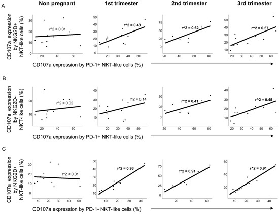 Similarly to CD8+T cells, a positive relationship was observed between the cytotoxic activity of the PD-1 positive and NKG2D positive NKT-like cell populations throughout pregnancy but not in the nonpregnant control group (Figure 8A). Examining the connection of the CD107a expression by PD-1 positive and NKG2D negative NKT-like cells, a weak positive relationship was observed only in the 2nd and 3rd trimester of pregnancy (Figure 8B). Moreover, strong positive linear regression was defined between the cytotoxicity in PD-1 negative and NKG2D positive NKT-like cells during the healthy pregnancy but not nonpregnant condition (Figure 8C).