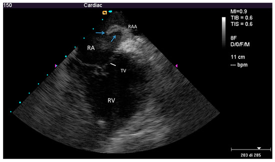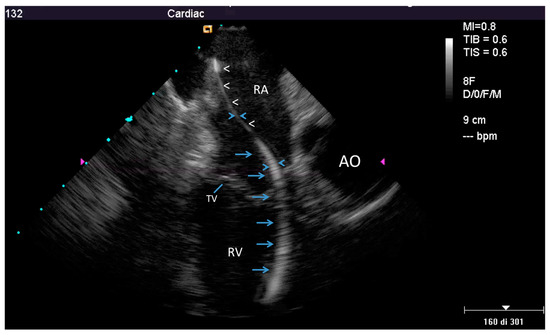 Example of a partially thickened lead at intracardiac echocardiography (ICE). Home view showing normal thickness of the proximal part of the lead in the right atrium (white arrow head), but evident thickening in the distal atrial part and in its ventricular course (≥4 mm, blue arrows); AO—aorta; RA—right atrium; RV—right ventricle; TV—tricuspid valve.