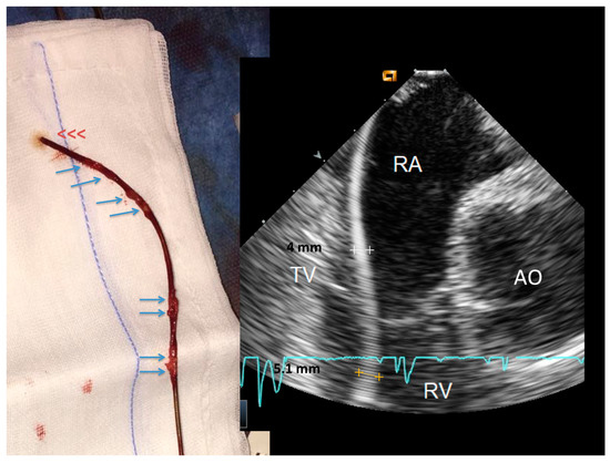- Rizzello, V.; Dello Russo, A.; Casella, M.; Biddau, R. Residual fibrous tissue floating in the right atrium after percutaneous pacemaker lead extraction: An unusual complication early detected by intracardiac echocardiography. Int. J. Cardiol. 2008, 127, e67–e68. [Google Scholar] [CrossRef] [PubMed]