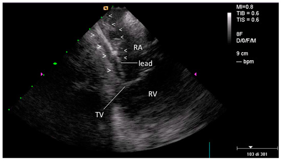 Transesophageal echocardiography (TEE) was performed after the extraction procedure (within one month) using commercially available equipment (Philips IE33, Eindhoven, Holland, ultrasound system) connected to a multiplane transducer (Philips X7-2t, 5 MHz transducer). Local anesthesia was applied to the hypopharynx by spraying it with xylocaine and all patients were sedated with benzodiazepines. The endoscope was introduced into the esophagus with the patient in left lateral position. A complete scan of the entire tricuspid valve and the leads was performed, tilting and alternately withdrawing and advancing the tip of the endoscope. In particular, the more specific TEE approaches for lead imaging before extraction were: bicaval TEE approach for the intra-caval and intra-atrial course (including the right atrial appendage course); cardial for the intracoronary sinus lead; and both transgastric and mid-esophageal 4-chamber for the intraventricular course.