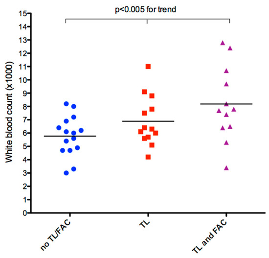 The presence of TL was significantly associated with higher white cell counts and longer implantation time (Table 2). In addition, the presence in the same patient of both TL and FAC was significantly associated with even higher blood cell count (Figure 4).