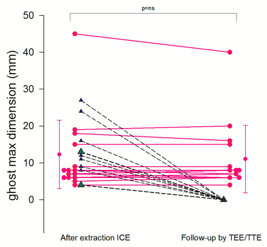 Ghost follow-up at 1 month. Individual value bar graph shows the destiny of the ghost as assessed by ICE (first column) and at 1 month follow-up by TEE (second column). Most of the ghost masses were still there (pink dots connected with solid line), while 7 had disappeared (triangles connected with dashed line). (2 masses, green triangles, were not assessed at follow-up because they were in an inaccessible part of the superior vena cava).