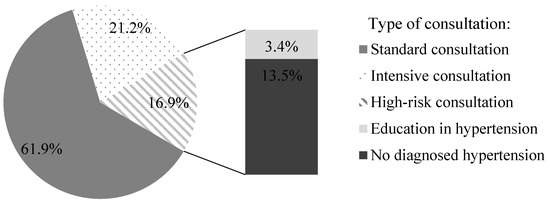 Research was conducted between January and April 2019 in a community pharmacy in Poznan, Poland. Study participants were randomly selected from patients who visited the community pharmacy as customers and were informed about the possibility of receiving free blood pressure screening. Individuals who agreed to having their blood pressure measured in the pharmacy were enrolled in this study. Participants had to meet two inclusion criteria: over the age of 18 years and no previous diagnosis of hypertension. Each participant was explained the scope of the study and informed that they could resign from further participation at any stage of the research project. A written consent was obtained from each participant. Three pharmacists were familiarized with the study protocol and trained by the investigators on implementation of the patient-counseling model during the blood pressure screenings in the community pharmacy. The new counseling model is presented in Figure A1. The first step of screening protocol was a short semi-structured interview followed by a blood pressure measurement performed with a certified electronic sphygmomanometer with upper-arm cuff (Medel, Check MY 17, Parma, Italy). Each cuff was selected individually for the patient to fit the arm size. The result was an average of 2 measurements with an interval of 1–2 min on the right and left limb. If the difference between the two measurements was greater than 10 mmHg, then a third measurement was taken on the arm that had a higher reading recorded in previous measurement. This reading was included in the average of the obtained measurements. The patient was prepared for examination according to the Polish Society of Hypertension recommendations. Each participant was instructed to rest for at least five minutes in a sitting position with the back supported in a quiet place in the community pharmacy before the measurement. The patient was not included in the study when drinking coffee and/or smoking at least 30 min before the visit. Based on the information obtained in the first step, each patient was assigned to one of three categories: standard consultation (SC: normal blood pressure, without risk factors), intensive consultation (IC: normal blood pressure with risk factors, e.g., family history, elevated blood glucose level and cholesterol), and high-risk consultation (HRC: blood pressure reading ≥ 140/90 mmHg) [10]. Subsequently, participants in each category received specific counseling and intervention in an especially designed, quiet, intimate place in the community pharmacy. SC included basic education of the patient in terms of appropriate lifestyle and prevention of hypertension. For IC, the education was adjusted to the specific risk factor identified in study participants. HRC referred the patient to the physician and provided detailed information on the potential possibility of hypertension with a discussion about risk factors. In each case, the patient received the appropriate educational leaflet. Only patients qualifying for HRC were scheduled for a second follow-up visit in the community pharmacy. If the physician confirmed hypertensive disease, the patient was counseled by a pharmacist and educated about hypertension and self-control of blood pressure.