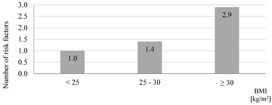 Average number of risk factors in relation to the body mass index (BMI) in study participants screened in a community pharmacy (n = 110, p = 0.0001).