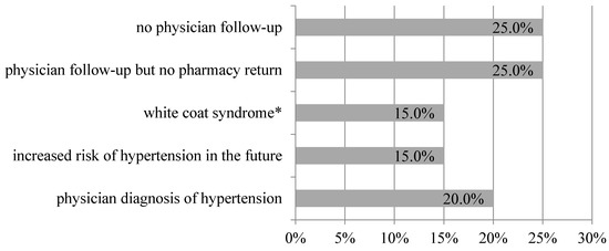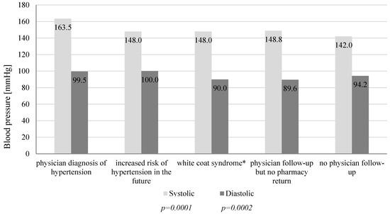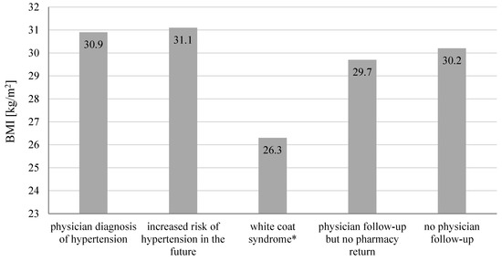 As a result of blood pressure screenings in a community pharmacy, 16.9% of participants with elevated blood pressure (≥140/90 mmHg) were unaware of it and were referred to a physician. In Poland, almost 40.0% of adults do not know their own blood pressure, and about 30.0% are unaware of having hypertension [10]. Education level showed a correlation with patient reaction to the results of the blood pressure screening. Individuals who had high blood pressure during screening at community pharmacy and were referred to the physician but did not return to the pharmacy with feedback had received a secondary education. We observed that participants with higher education were more aware of the negative effects of hypertension and were more attentive to taking care of their health. They showed the greatest sense of responsibility for their health and confirmed their willingness to reeducate themselves in the pharmacy in the field of diagnosed disease. Literature reports show that higher education correlates with better knowledge and information about hypertension, which in turn results in a healthier lifestyle [18]. On the other hand, the lower socio-economic status, assessed according to the level of education, is associated with a higher incidence of hypertension in young adults [19]. Most people who had an increased risk of developing the disease in the future were obese. Obesity or even excessive weight is inevitably associated with an increased risk of cardiovascular disease. It is also a consequence of comorbidities together with overweight [20]. During the study, we noticed that all the people diagnosed with hypertension by the physician were obese. Of the people referred to the physician, hypertension has since been diagnosed in 20.0% and they have started pharmacotherapy. Their mean blood pressure was the highest among all patients referred to a physician, and their mean BMI was indicative of obesity.