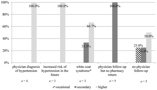 Effect of education level on outcomes from blood pressure screening among study participants who received a high-risk consultation (n = 20, p = 0.0380). * patient with elevated blood pressure upon physician visit, but with normal results at home.