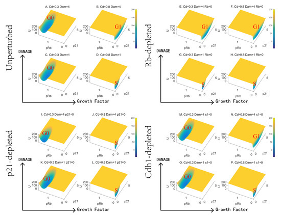Landscape results illustrate that Rb control the RP and p21 is in charge of the G1/S checkpoint. We further evaluate the roles of growth factor and DNA damage based on landscape topography. To do that, we modeled the depletion of Rb, p21, Cdh1 and compared simulation results with the undisturbed system (Figure 4). Specifically, we set four conditions of each depletion, which correspond to high and low concentration of mitogens, and high and low intensity of DNA damage, individually. We used the growth factor (induced CycD) to reflect the level of the mitogens.