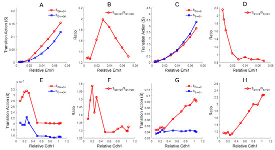 Effects of Emi1 (A–D) and Cdh1 (E–H) on the transition action (S) between G0 and G1 and between G1 and S. (A) The effect of Emi1 on the transition action between G0 and G1. The x axis represents the relative concentration of Emi1, and the y axis represents the value of the transition action (S). The red line represents the action from G0 to G1 and the blue line represents the action from G1 to G0. (B) The ratio of the action between G0->G1 and G1->G0 changes with Emi1. (C) The effect of Emi1 on the transition action (S) between G1 and S. (D) The ratio of the action between G1->S and S->G1 changes with Emi1. (E) The effect of Cdh1 on the transition action (S) between G0 and G1. (F) The ratio of the action between G0->G1 and G1->G0 changes with Cdh1. (G) The effect of Cdh1 on the transition action (S) between G1 and S. (H) The ratio of the action between G1->S and S->G1 changes with Cdh1.