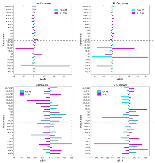 Sensitivity analysis for the 23 parameters on the transition action of G0->G1 (A), G1->G0 (B), G1->S (C), and S->G1 (D). The x axis represents the relative change of transition action in terms of unperturbed system, denoted by S/S. Some sensitive parameters were increased or reduced by 0.5% (below the dotted line), including kSyCe, kSyCa, kSyE2F, kSyP21, kSyP53, Rbt, Cd, kDeCe, kDeE2F, kDeP21, abd kDeP53, while the other parameters were increased or decreased by 5% (above the dotted line). (A,B) the magenta bar represents the G1->G0 transition, and the cyan bar represents the G0->G1 transition. (A) Each parameter was increased for the transition between G0 and G1. (B) Each parameter was decreased for the transition between G0 and G1. (C,D) The magenta bar represents the S->G1 transition, and the cyan bar represents the G1->S transition. (C) Each parameter was increased for the transition between G1 and S. (D) Each parameter was decreased for the transition between G1 and S.