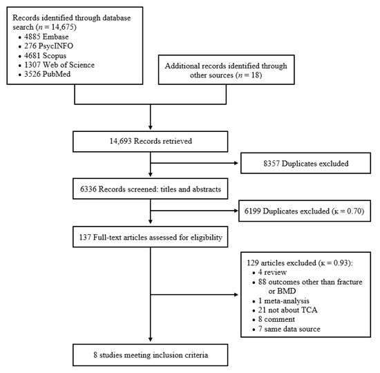 PRISMA flow chart of the study selection (BMD, bone mineral density, TCAs, tricyclic antidepressants).