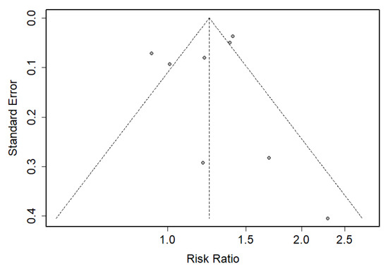 Funnel plot of the risk ratio vs. the standard error. Data were analyzed using the frequentist meta-analysis approach.