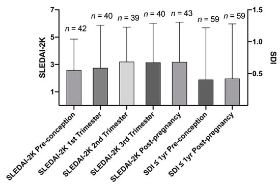 SLEDAI-2K scores illustrated during each trimester as well as 6 months pre-conception and 6 months post-pregnancy; and SLICC/ACR damage index (SDI) up to 1 year pre-conception and 1 year post-pregnancy (termination of pregnancy). Data show mean ± standard deviations.