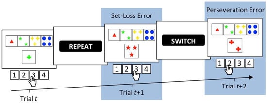 A showcase trial sequence on the computerized WCST [12,13,14] which was used in this study [15]. On Trial t, the stimulus card depicts one green cross. It could be sorted by the color category (inner left key card, response 2), the number category (far left key card, response 1), or the shape category (inner right key card, response 3). The observation of response 3 indicates that the shape category was applied. A subsequent positive feedback (i.e., “REPEAT”) indicated that this response was correct and that the shape category should be repeated on the upcoming trials. However, on Trial t + 1, response 3 was pressed, indicating that the number category was applied. Erroneous switches of the applied category following positive feedback are called set-loss errors. Next, a negative feedback (i.e., “SWITCH”) indicates that this response was incorrect, implying that a category switch is required. On Trial t + 2, the number category was erroneously repeated as response 2 was pressed. Erroneous repetitions of categories after negative feedback are called perseveration errors.