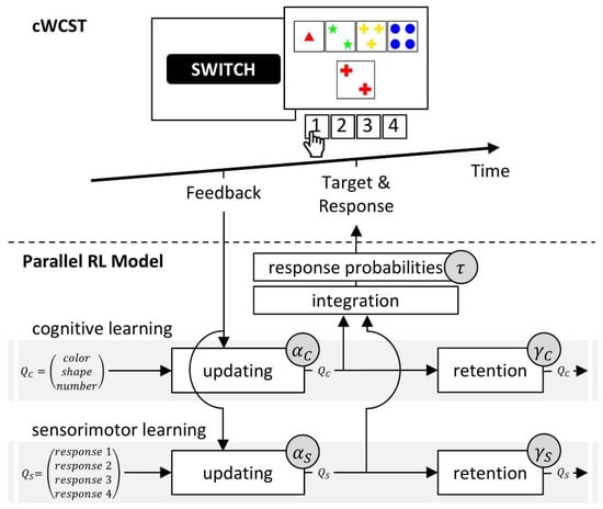 The parallel RL model [40,41] is based on a conceptualization of cWCST behavior as parallel cognitive and sensorimotor learning. Cognitive and sensorimotor learning are operationalized by Q-learning algorithms [71,108,109,110,111]. The implemented Q-learning algorithms operate on feedback prediction values, which quantify the strength of prediction of positive (feedback prediction values larger than 0) or negative feedback (feedback prediction values less than 0) following the application of a specific category (for cognitive learning) or the execution of a response (for sensorimotor learning). On any trial, feedback prediction values are updated in response to an observed feedback (Equations (A3) and (A7)). How strong feedback prediction values are updated is modulated by prediction errors, which are the difference between the observed feedback and the current feedback prediction value (Equations (A2) and (A6)). Higher absolute prediction errors indicate stronger updating of feedback prediction values. Appendix B gives a mathematical description of the parallel RL model as well as details of parameter estimation.