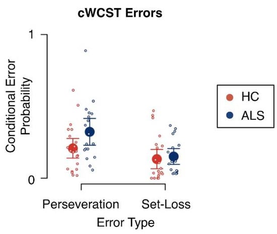 We analyzed PE (i.e., erroneous repetitions of the applied category after negative feedback) and SLE (i.e., erroneous switches of the applied category after positive feedback) [12,40,41]. Conditional error probabilities were computed as the ratio of the number of committed errors and the number of trials on which a respective error type was possible (i.e., all trials following negative or positive feedback for PE and SLE, respectively). We analyzed conditional error probabilities by means of a Bayesian repeated measures analysis of variance (ANOVA) using JASP version 0.11.1 (JASP Team, Amsterdam, The Netherlands) [106]. The Bayesian ANOVA included the within-subjects factor error type (PE vs. SLE) and the between subjects factor group (HC vs. ALS).