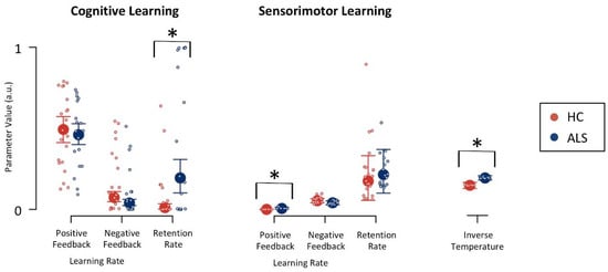 Model parameters for cognitive and sensorimotor learning. Large circles indicate medians of group-level posterior distributions. Error bars indicate lower and upper quartiles of group-level posterior distributions. Small circles indicate medians of individual-level posterior distributions; a.u. = arbitrary units; * strong evidence for the presence of a group difference; HC = healthy control participants; ALS = amyotrophic lateral sclerosis patients.
