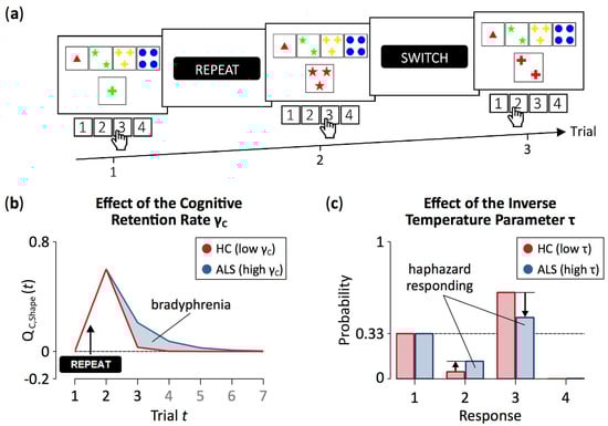 Computational modeling also revealed that ALS patients show increased inverse temperature parameters in comparison to HC participants. The inverse temperature parameter expresses how well finally executed responses corresponded to the information that has been learned from feedback which was received on previous trials (for illustration, see Figure 5a,c) [71,85,86,87]. With high values of the inverse temperature parameter, overt responses are more independent of learned information, rendering responding more haphazard. Thus, our results indicate that ALS pathophysiology [21] comprises another symptom, which might be best described as haphazard responding. Haphazard responding in ALS patients could also be related to subclinical manifestations of frontal disinhibition, which represents a major symptom of frontotemporal dementia [100,103]. Alternatively, it also remains possible that the increased inverse temperature parameter in ALS patients expresses ALS-related motor impairments, such as deficient fine motor skills that compromise responding as required for successful cWCST behavior [100].