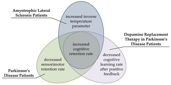 There were some striking divergences between alterations in latent variables in ALS and PD patients (see Figure 6). First, inverse temperature parameters were found to be increased in ALS patients, but they were not found to be altered in PD patients [41]. Thus, increased inverse temperature parameters could be related to dysfunctions in the motor cortex of ALS patients [21]. Second, PD patients showed decreased sensorimotor retention rates, which indicated impaired stimulus-response learning in PD patients [41]. The sensorimotor retention rate was not found to be altered in ALS patients. Sensorimotor learning is putatively supported by striatal areas [41,79], which are primarily affected in PD patients [29,30]. Hence, decreased sensorimotor retention rates could be specifically related to PD patients’ dysfunctions in striatal brain areas. Finally, DA replacement therapy in PD patients induced decreased cognitive learning rates following positive feedback [41]. DA replacement therapy overstimulates the meso-limbic DA system in PD patients [96,97,98,99], which is associated with anticipation of reward or positive feedback [123,124]. Decreased cognitive learning rates following positive feedback due to DA replacement therapy might be a computational corollary of potential overstimulation of the meso-limbic DA system in PD patients through clinically titrated DA replacement therapy [41].