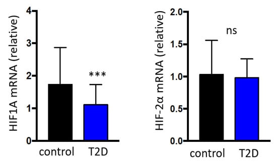 Relative HIF-1α and HIF-2α gene expression based on the presence of type 2 diabetes. Data are presented as median and interquartile. *** p < 0.001; ns = non-significant. HIF: Hypoxia-Inducible Factor; T2D: type 2 diabetes; mRNA: messenger ribonucleic acid.