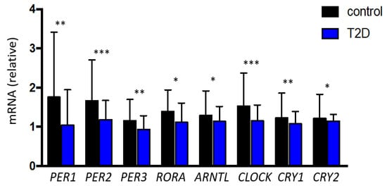 Relative gene expression of the clock genes evaluated in the study according to the presence of type 2 diabetes. Data are presented as median and interquartile. *** p < 0.001; ** p < 0.01; * p < 0.05. PER: Period Homolog Proteins; RORA: Retinoid-related Orphan Receptor Alpha; ARNTL: Aryl hydrocarbon Receptor Nuclear Translocator-Like protein-1; CLOCK: Circadian Locomotor Output Cycles Kaput; CRY: Cryptochrome proteins; T2D: type 2 diabetes.
