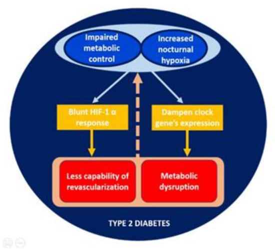 Type 2 diabetes was also associated with a significant reduction in the expression of a great variety of clock genes. Our results are in concordance with those published by Ando H et al. in a smaller group of patients, in which mRNA expression pattern of BMAL1, PER1, PER2 and PER3 were significantly lower in patients with diabetes than in healthy controls [30]. In this study, the transcript expression of the same genes was inversely correlated with HbA1c levels [30]. It is well known, from the study of work rotating night shifts, that the disruption of circadian rhythmicity is strongly associated with the appearance of metabolic alterations such as obesity, hypertension, and metabolic syndrome [31,32]. Whether these metabolic disruptions are perpetuated by chronic hyperglycemia or sleep breathing disorders remains to be elucidated. Similarly, the combined downregulation in the expressions of CRY1 and PER3 at midnight predicted the severity of the disease in patients with obstructive sleep apnea/hypopnea syndrome [18]. Additionally, in patients with type 2 diabetes, those with the poorest sleep quality showed a dampened mRNA expression of clock genes such as BMAL1 and PER1 [33]. Therefore, we propose that the disorder in nocturnal breathing that characterize the sleep of patients with type 2 diabetes could alter the circadian rhythm (Figure 3). It is also important to emphasize that these alterations are closely associated with the degree of metabolic control, leading to consider the potential effect that the improvement of glycemic control can exert on the recovery expression of HIF-1α and clock genes. Similarly, and following this bidirectional pattern, it is plausible to think that the treatment of nocturnal hypoxemia with CPAP can partially restore the impaired hypoxic pathways and improve the clock genes transcription. However, Moreira et al. failed to find improvement in CLOCK expression with CPAP treatment in 17 men with severe SAHOS without type 2 diabetes [34]. This result could suggest that other mechanisms beyond hypoxia and hyperglycemia are involved in the complex regulation of the clock gene system.