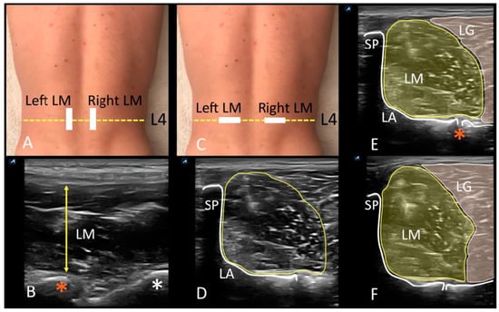 Ultrasonographic evaluation of the lumbar region. (A) Probe location for longitudinal assessment of lumbar multifidus at L4 vertebral level (yellow dotted line). (B) Longitudinal scanning view of LM (yellow arrow), and L4/5 (orange asterisk) and L5/S1 (white asterisk) facet joints visualization. (C) Probe location for transverse scanning of lumbar multifidus at L4 vertebral level (yellow dotted line). (D) Transverse scanning view of the lumbar multifidus, and visualization of the L4 spinous process (SP), the laminae (LA) and L4/5 facet joint as measurement landmark, and CSA of LM; (E), CSA of lumbar multifidus at resting (LM) and borders delimitation with lumbar longissimus muscle (LG), as well as the white enhancement of the L4 spinous process (SP), the laminae (LA), and facet joint of L4/5 (orange asterisk). (F) CSA of lumbar multifidus (LM) during muscle contraction (CAL test) and borders delimitation with lumbar longissimus muscle (LG). Abbreviations: CAL, contralateral arm lift test; CSA, cross-sectional area; LA, laminae; LG, lumbar longissimus muscle; LM, lumbar multifidus; SP, spinous process.