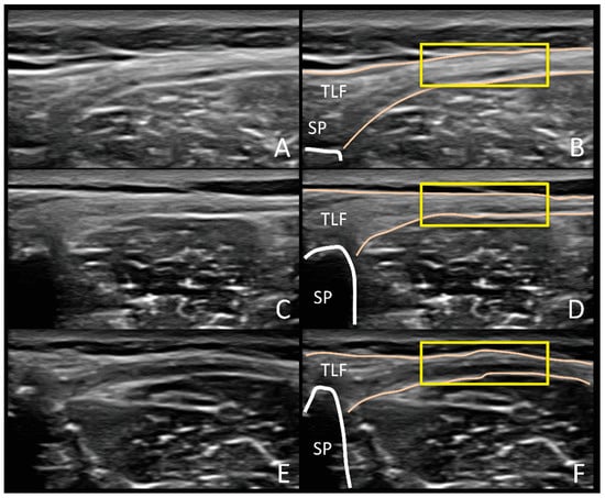 Ultrasound imaging assessment of thoracolumbar fasciae morphology and categorization based on Likert-scale type which considers fascial lines delimitation and organization, echogenicity and the ability to draw a rectangular box around the hyperechoic fascial layers (organized). The figure shows sample homologous images of a “very organized” ((A,B); Group = 4, Likert-scale type score = 9), “somewhat organized” ((C,D); Group = 3, Likert-scale type score = 7) and “somewhat disorganized” ((E,F); Group = 3, Likert-scale type score = 5) thoracolumbar fasciae. Abbreviations: SP, spinous process; TLF, thoracolumbar fasciae.