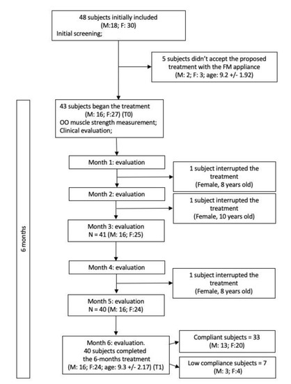 Five subjects (3 females, 2 males, mean age 9.20 ± 1.92 years) did not accept the treatment plan and three children (3 females; mean age 8.67 ± 1.15 years) did not complete the protocol. Therefore, a final sample of 40 children with atypical swallowing was included in this study. The flow chart of the study is represented in Figure 2.