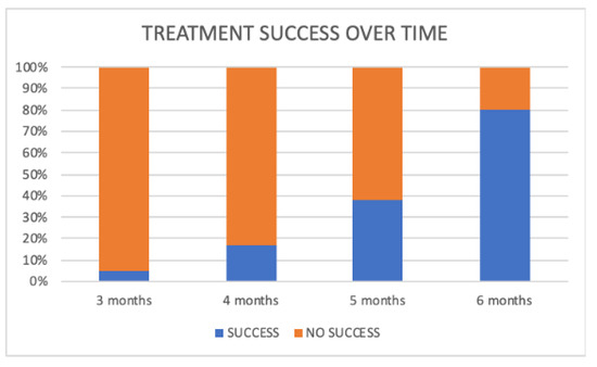Increase in the percentage of subjects with treatment success vs. no success recorded over time in the whole sample (n = 40).